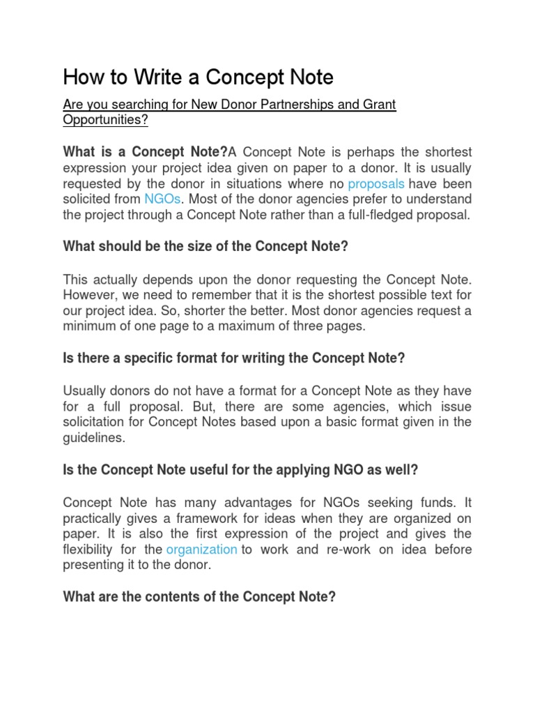Concept notes, as its name suggests, is a brief summary that discusses the ideas regarding a project being proposed and the objectives that it is aiming to achieve. Example concept sheet research funding. Box 106, nchalo, chikwawa, malawi, central africa. Funders or donor may require the submission of a concept note, prior to that of a full proposal, to determine whether the activity is worth funding. Sample proposal are required from ocjs grants, it is a good example of a universal—and sound—funding proposal.
